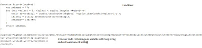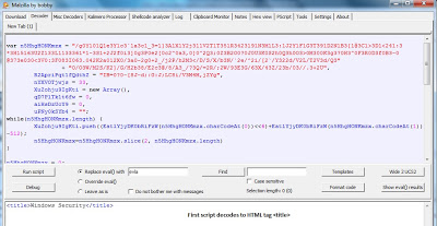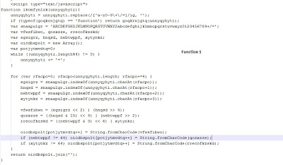 As I mentioned in the earlier blog post, these are fake security attempting to coerce the victim into downloading fake antivirus software that will download additional malware onto the system. The code for doing these animations and initiating the download of malicious binaries is hidden inside the malicious script. Let’s decode the main script. The malicious JavaScript code has two functions defined and three lines of code to decode the content. Here is how they look:
