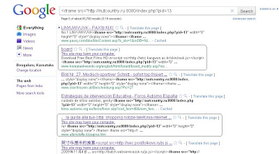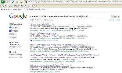 The malicious IFrame points to “hxxp:// nutcountry.ru:8080/index.php?pid=13” which is currently down. By taking the advantage of known/unknown vulnerabilities, attackers have injected malicious IFrames into many legitimate web pages. In this particular case, not only the home page is infected, but all the other pages on the site are infected. This likely indicates that the attacker used a SQL injection vulnerability to inject the malicious IFrame into the backend database from which webpages are dynamically generated. A quick search on Google reveals a significant number of websites infected with with the same IFrame. Here is screenshot of the search results: