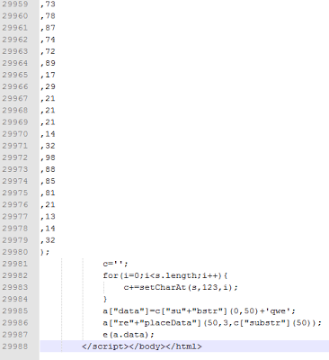 The aforementioned domains suggest that random domain names are being registered to host these attacks. Once visited, the victim will be presented with obfuscated JavaScript code, formatted in such way to evade IDS, IPS and antivirus solutions. The numbers in the arrays used by the scripts are intentionally spread across separate lines. This way the size of HTML file becomes huge and the total code spans 29K lines. Here is the snapshot of the first part of the malicious code:Image