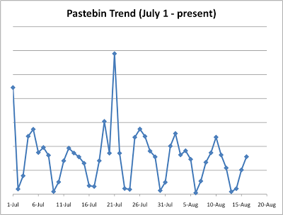 Following Q2, some of the LulzSec activity has settled down, so with the exception of two spikes in July, a slight overall decrease has been seen in recent Pastebin transactions versus Q2. This is what the July 1 to present chart looks like: