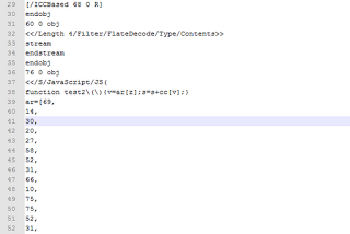 For analysis purposes, we can manually downloaded the aforementioned PDF files. The PDF files contain a JavaScript object, which contains obfuscated JavaScript, as shown below: