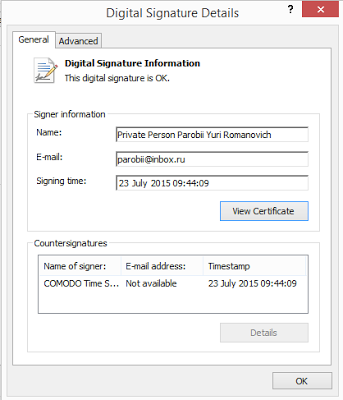 Here we came across one malicious attachment with an encrypted macro that downloads signed Dridex samples from 81.17.28.101/bt/bt/sti[.]php. This Dridex sample is packed using a custom packer, which is is compiled with .NET. The current Dridex is signed with a certificate that is issued to Private Person Parobii Yuri Romanovich. This certificate as been specially created for spreading the Dridex malware.