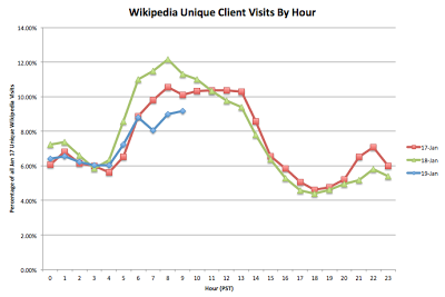 If you want a quick way of increasing traffic to your website - change or take down portions of your website in protest ... at least that is what we have gleaned from today's (1/18) Wikipedia protest against SOPA. There will likely be other blog posts and stats released on the results of this and other cyber protests - here is what we have seen from traffic thus far that has passed through one of Zscaler's clouds.
