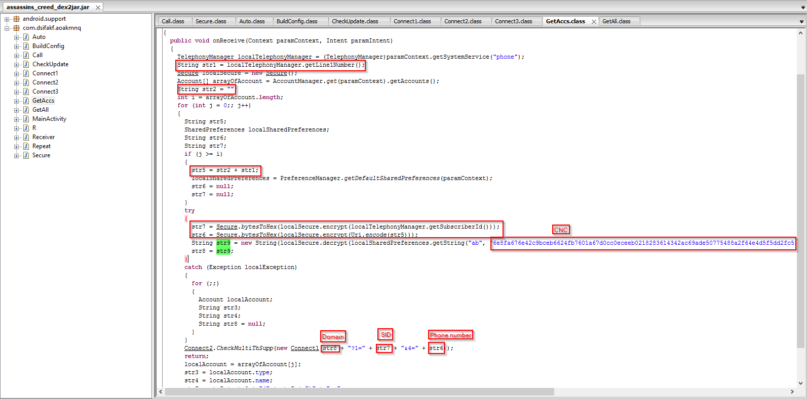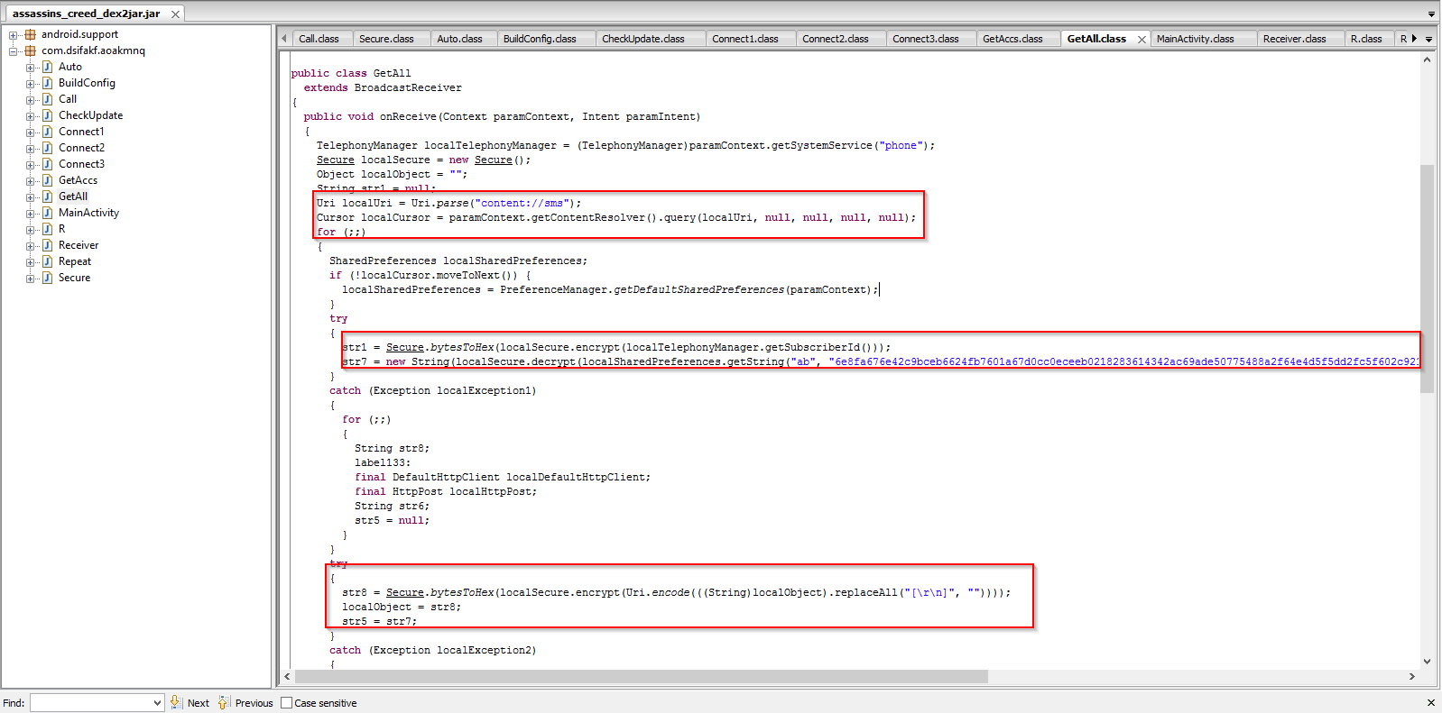 The malicious application is capable of sending multi-part text messages, harvesting text messages from a victim's device, and sending stolen information to a remote Command & Control (C2) server. We were able to locate phone numbers belonging to Russian bank "Volga-Vyatka Bank of Sberbank of Russia" in the malicious application code for which SMS messages are being intercepted to steal sensitive information. Another interesting feature we saw is the usage of AES encryption for all the C2 communication. It also harvests the mobile number and Subscriber ID information from the victim device for tracking purposes.