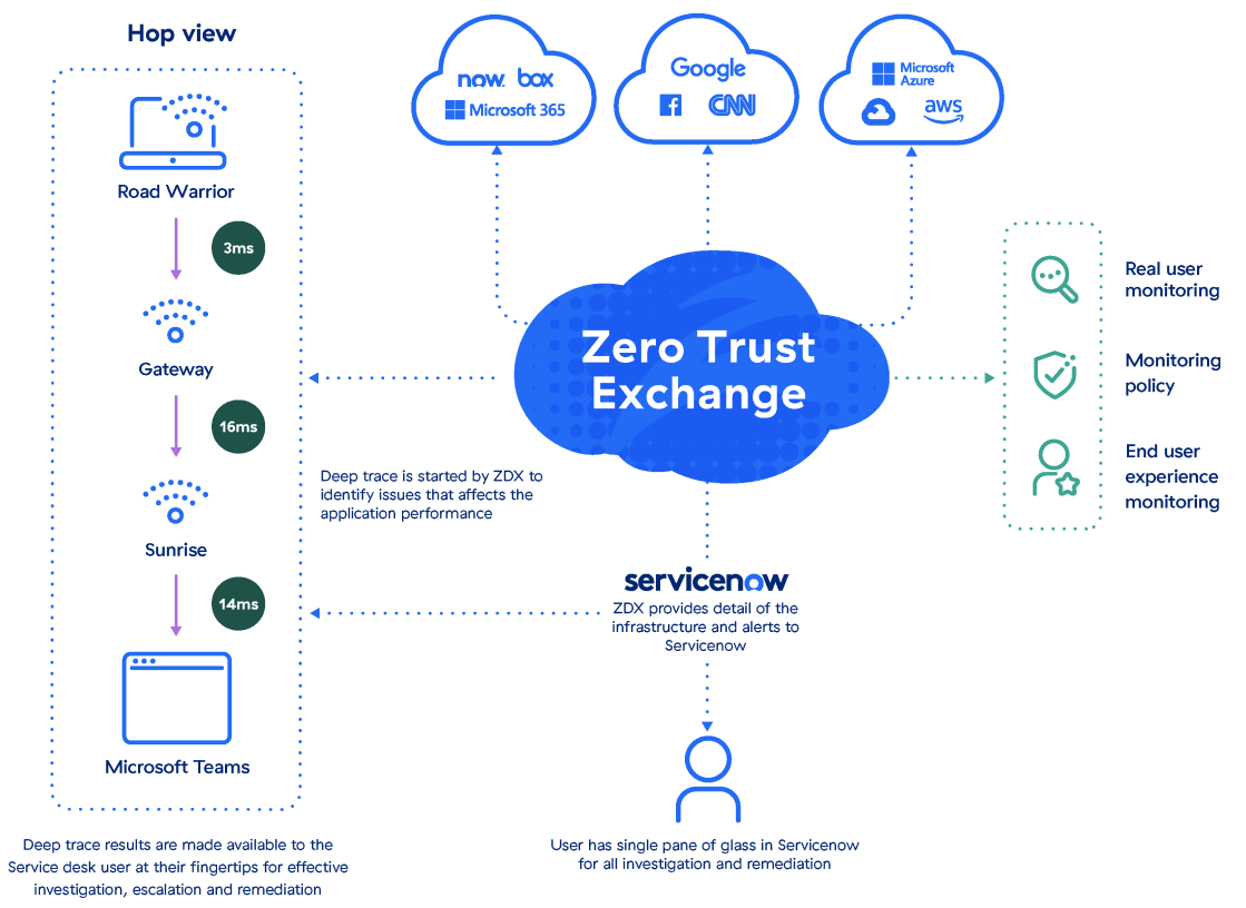 ZDX and ServiceNow integration helps your IT and Service Desk teams collaborate quickly. ZDX provides deep device-level diagnostics, network insights, and application performance metrics so you can rapidly resolve issues or escalate them to the right teams.