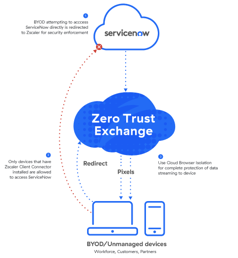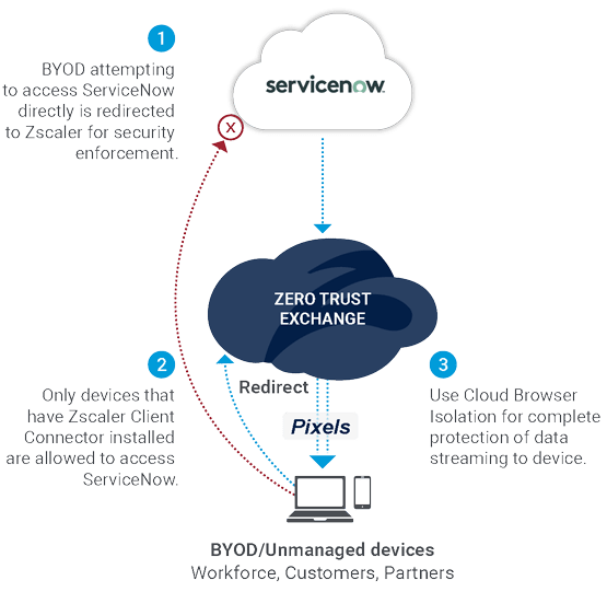 Through the Zscaler Zero Trust Exchange, organizations can remove the risks associated with BYOD and unmanaged devices accessing ServiceNow data.