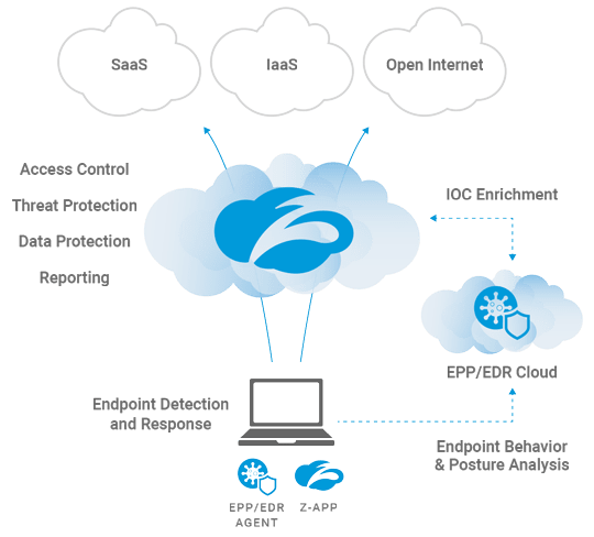 Zscaler works with endpoint security innovators to enable end-to-end threat detection, intel sharing, remediation, and device posture-driven access control to all on-premises and cloud apps.
